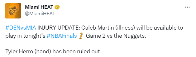 G2赛前热火官宣希罗因手部伤病继续缺席比赛,马丁(生病)可以出战,将替补参加G2。