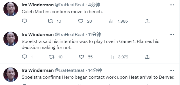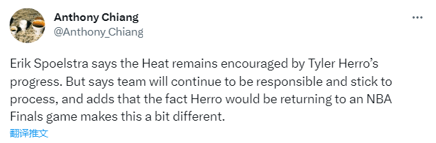 据斯帅透露,希罗来到丹佛后进行了对抗训练,热火仍对希罗的康复进展感到鼓舞,但球队将继续承担责任并坚持整个复出过程,希罗的复出将让总决赛会变得不同;掘金主帅马龙则表示他们早就为希罗复出做准备了,不过希罗因伤继续伤停,自从首轮G1遭遇伤病后,希罗已经连续缺席19场比赛,G3能否复出还是未知数。