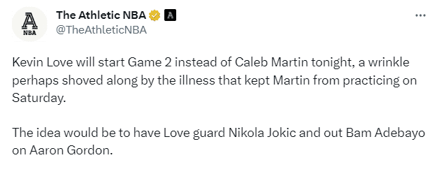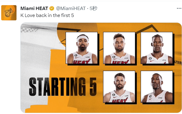 JRS直播网讯06月05日,总决赛G2一触即发,热火G2大变阵,官宣乐福顶替马丁重返首发阵容,搭配阿德巴约、文森特、斯特鲁斯和巴特勒首发出战;掘金则是延续原有的首发阵容,约基奇、穆雷、波普、小波特和戈登继续担任首发五虎。