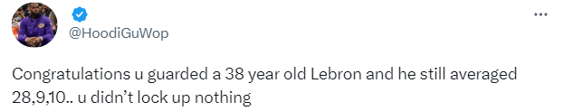 戈登如此言论引热议,湖人球迷回应戈登,发推写道:祝贺你防守的是38岁的勒布朗,而他仍然场均拿下28分9篮板10助攻(注:系列赛场均数据)……你什么都没防住。