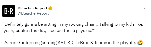 总决赛G1赛后,谈到季后赛防守詹姆斯、杜兰特、巴特勒和唐斯的经历,戈登表示:当我 八九十岁时,我肯定会坐在我的摇椅上和我的孩子们吹牛逼,'是的,当年我防住了这些家伙。’不过,这就是比赛的一部分,我在做我的球队需要我做的事。正如我所说,这是团队努力,一向如此。需要场上5个人的配合才能完成完整的防守。