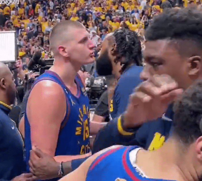 之后约基奇冲着现场球迷送飞吻,做出一个庆祝手势后离场返回更衣室。