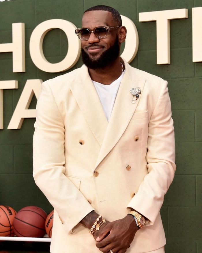 詹姆斯戴着墨镜,身穿一套白色西装,帅气亮相并且搂着萨瓦娜十分恩爱;萨瓦娜身穿一套黑色镂空透视装,一头金发十分性感,老詹的高中队友们也来到了现场。