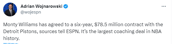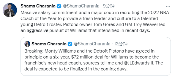 JRS直播网06月01日,太阳前教练蒙蒂再就业并且签下一份超级执教大合同,据名记shams报道,蒙蒂-威廉姆斯和活塞达成一份6年7200万美元的续约合同,将成为活塞新主帅,预计合同将在未来几天正式敲定,更多内幕曝光,蒙蒂合同最高能够达到8年1亿美元;woj跟进报道,蒙蒂已经和活塞签下6年7850万美元合同,这是历史最大执教合同。