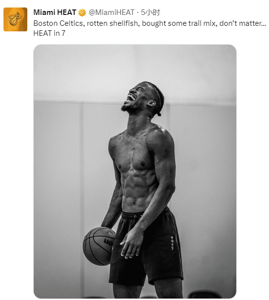 热火官推晒出巴特勒赤膊露腹肌的硬汉照,写道:无论如何,热火最终赢下抢七大战;热火官方还恶搞在波士顿毁掉了凯尔特人的庆祝之夜。