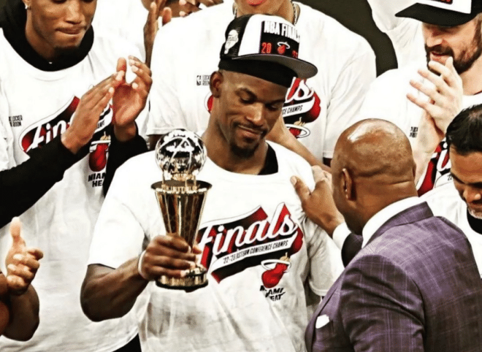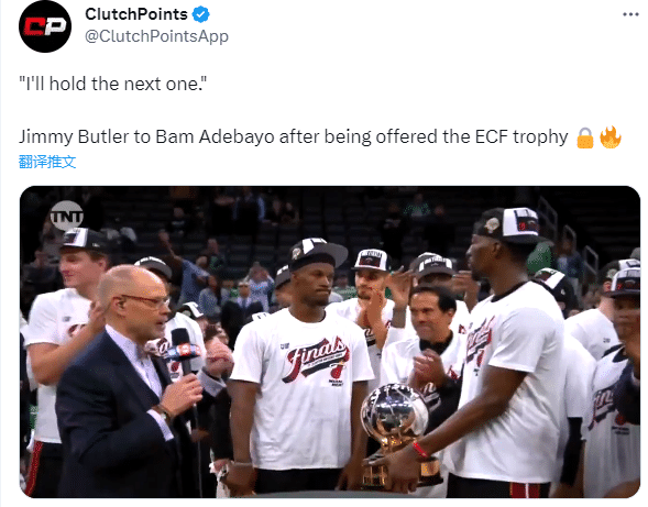 在东部冠军颁奖仪式上,阿德巴约率先举起东部冠军奖杯(鲍勃-库西杯),之后他想把奖杯递给巴特勒,不过巴特勒并不想捧起这座奖杯,拒接后告诉阿德巴约:我来拿下一个(指总冠军奖杯)。