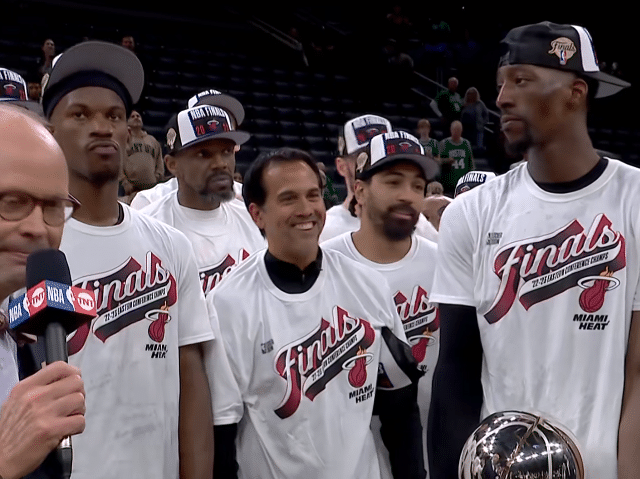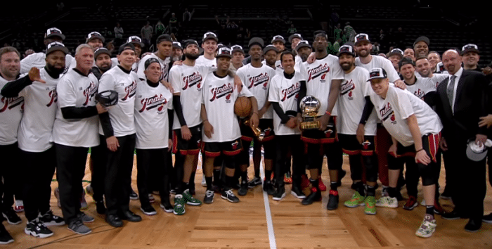 JRS直播网讯05月30日,NBA东部冠军诞生,热火东决4-3淘汰凯尔特人,正式夺得东部冠军,与掘金会师总决赛争夺总冠军;巴特勒(5票)险胜马丁(4票),生涯首次夺得东决MVP,在东部冠军颁奖典礼上,莫宁为热火颁发东部冠军奖杯,阿德巴约高高举起东部冠军奖杯,巴特勒获MVP后十分淡定,在东部冠军合影中,巴特勒抱着MVP站在C位,阿德巴约抱着东部冠军奖杯,热火全队将直接飞往丹佛.