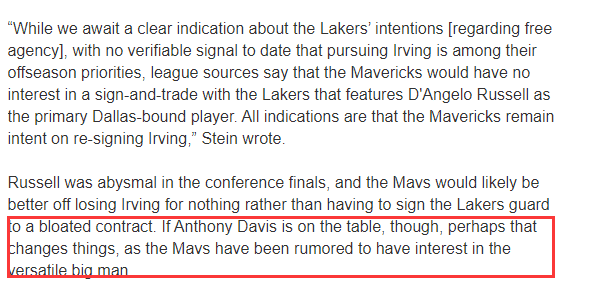 独行侠对以拉塞尔为主体的先签后换交易没有兴趣,但独行侠对浓眉很感兴趣,如果浓眉出现在谈判桌上,也许独行侠愿意和湖人谈判交易;目前情况下,湖人只能通过三方交易来引进欧文。