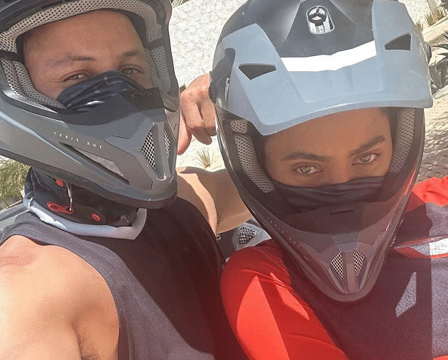 这是库嫂阿耶莎晒出了动态,她和库里一起去越野,开着越野摩托、戴着头盔,出发之前自拍,库里还秀肌肉,阿耶莎嘟嘴,两人确实非常恩爱,他们在越野摩托前面进行合影、拍照。