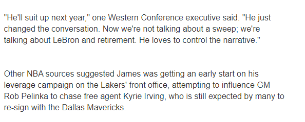 B/R记者Eric Pincus就詹姆斯表示自己可能会选择退役一事采访了多位联盟人士,一位西部高管谈及此事说道:詹姆斯下赛季会出场的,他只是改变了话题。现在大家讨论的不是横扫,而是在讨论詹姆斯和退役。他喜欢控制叙事。
