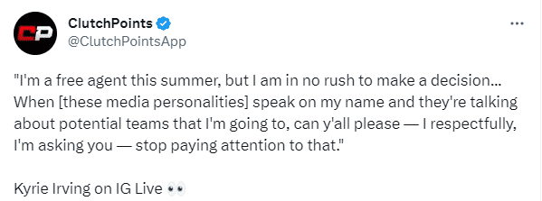 不久前,欧文本人在直播时回应外界流言,表示:今年夏天我将成为自由球员,但我并不急于做出决定。当那些媒体提到我的名字,并谈论我可能加盟的球队时,我尊敬地请求你们,能不能不要再关注这些了。