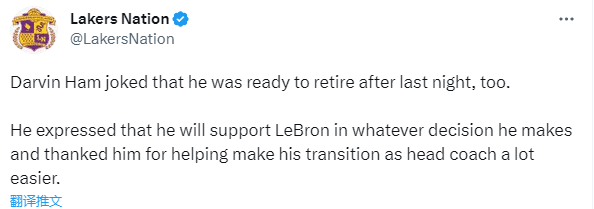 谈到詹姆斯考虑退役话题,哈姆说:无论勒布朗做出什么决定,我都会支持他,很感谢他帮助我更轻松地完成首次担任主教练的过渡。