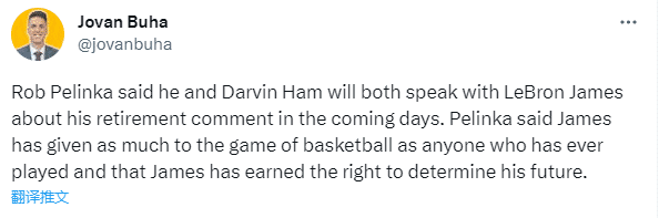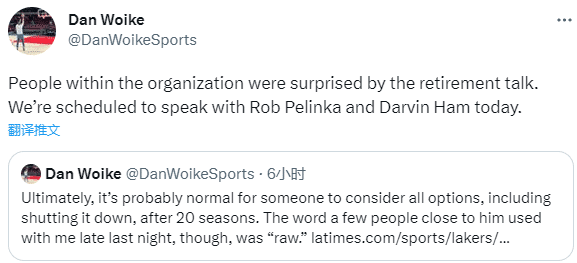 湖人止步西决后,詹姆斯表示他考虑退役,湖人队记Dan Woike跟进报道,湖人队内部对詹姆斯谈到考虑退役的话题感到惊讶,今天球队内部人员会对此与总经理佩林卡和主教练哈姆进行交流。
