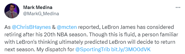 难道老詹真要退役吗?名记Chris Haynes和Marc Stein都在播客节目中表示预计詹姆斯不会退役;他们还表示詹姆斯希望在职业生涯这个阶段成为球队第二选择,预计拉塞尔下赛季不会再穿湖人球衣了。