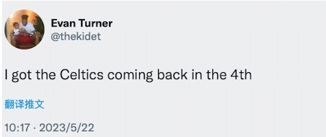 凯尔特人的名宿直接倒戈嘲讽,前凯尔特人球员、前凯尔特人助教埃文-特纳发推写道:“我看好凯尔特人末节逆转比赛。”很显然埃文-特纳并不是真的看好绿衫军,而是在嘲讽老东家。