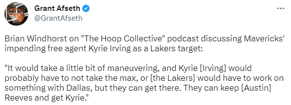 曝欧文预计将和独行侠签下4年2.1亿美元新合同,不过湖人仍想为詹姆斯追求欧文,据ESPN记者Brian Windhorst报道,湖人追求欧文可能需要一些动机,欧文可能拿不到顶薪合同,或者湖人和独行侠达成一些合作,湖人可以引援欧文并且留下里夫斯。
