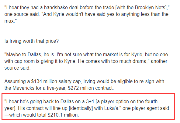 一位联盟经纪人透露,欧文将以3+1(第四年的球员选择权)的续约方式回到达拉斯。他的合同将与东契奇的合同保持一致。合同总额为4年2.101亿美元。