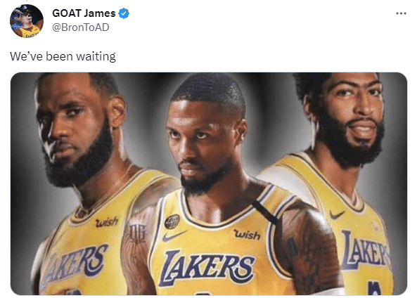 利拉德暗示想要离队的动态备受关注,短短6个小时,浏览量接近1000万次,8000多人转发,有球迷批评利拉德想要申请离队却想要球迷被谴责;还有球迷表示利拉德找到了一种申请离队的方式;湖人球迷晒詹姆斯、浓眉和利拉德身穿湖人球衣的合影P照,写道:我们等着呢;还有球迷希望利拉德加盟马刺联手文班亚马。