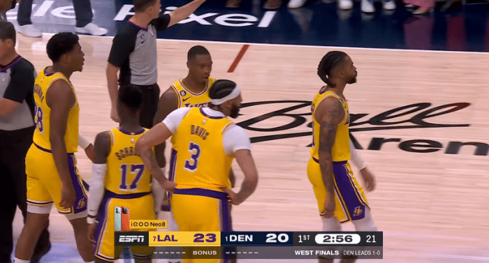 第一节最后3分多钟,八村垒防守约基奇时有一个明显推人动作,裁判没有任何吹罚,掘金球迷嘘声不断,之后穆雷快攻反击,拉塞尔劈头盖脸放倒穆雷,后者重摔倒地,裁判回放之后拉塞尔一级恶意犯规,詹姆斯摊手抱怨十分不满。