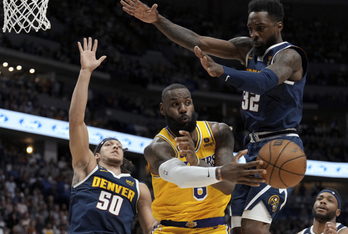 詹姆斯下场休息后掘金反扑追分,5分07秒詹姆斯重新上场,中投和三分都打铁,掘金继续缩小分差,湖人将近6分钟没有运动战进球,1分36秒詹姆斯突破上篮打破僵局,之后老詹助攻八村扣篮,半场打完湖人53-48领先5分。