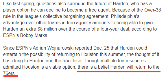 由于受制于38岁条款,哈登今夏最高可以和76人续签4年2.1亿美元的新合同,而其他球队最多可以给4年2.02美元,换言之,76人可以比其他球队多给800万美元。