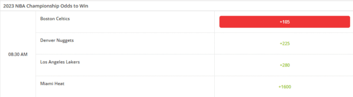 最新夺冠赔率也出炉,排位顺序和概率是一样的。绿军(+105)排名第一,掘金(+225)位居第二,湖人和热火分列第三和第四位。