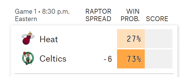其他概率数据显示,绿军被看好78%的概率晋级总决赛,掘金是70%,湖人30%,热火22%。东部决赛和西部决赛G1的获胜概率也出炉了。
