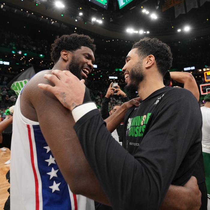 赛后恩比德大笑拥抱塔图姆,这一次他大度告别赛季。
