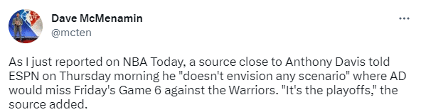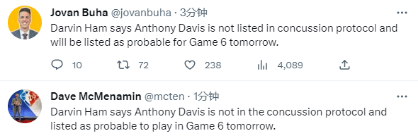 浓眉没有遭遇脑震荡,对于湖人来说,这是一个天大的好消息;另外名记Chris Haynes和Dave McMenamin都表示,浓眉将会出战湖勇G6关键一战。