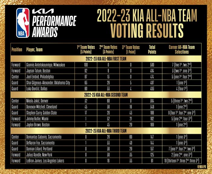 塔图姆92张第一选票,总分484分;恩比德87张第一选票,总计474分;亚历山大63张第一选票,总分407分,东契奇60张第一选票,总分403分。