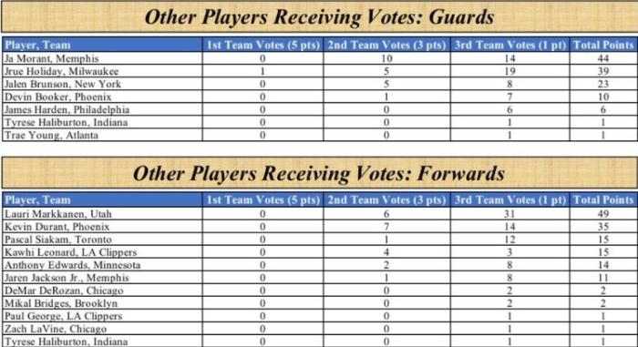 落选最佳阵容的球员得票情况——莫兰特44分、雄鹿霍乐迪39分、布伦森23分、布克10分,哈登6分,哈利伯顿和特雷-杨1分。