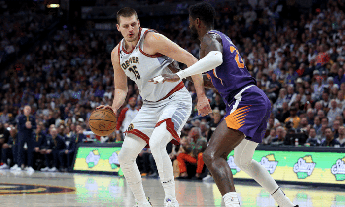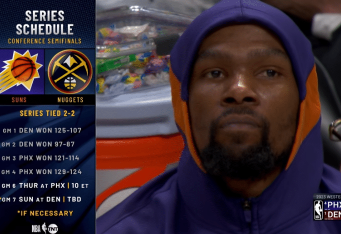 末节杜兰特和布克继续带队抵抗,约基奇和穆雷带队牢牢掌控局面,由于分差太多,太阳提前放弃,约基奇等也打卡下班,最终掘金主帅拿下天王山。