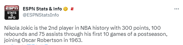 1、约基奇在本次季后赛前10场比赛中,得到了至少300分100板75助,成为NBA历史第二人。1963年的季后赛,奥斯卡-罗伯特森曾做到这一点。