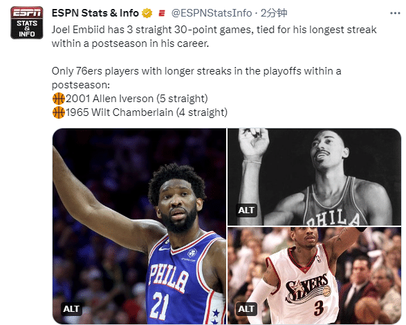 JRS直播网05月10日,NBA季后赛76人G5击败凯尔特人夺赛点,系列赛大比分3-2夺赛点,恩比德全场23投10中拿到33分7篮板3助攻4盖帽,追帽塔图姆和布朗双探花太疯狂,末节轰进三分疯狂庆祝以及大笑鼓掌,恩比德创纪录,季后赛连续3场30+追平生涯最长纪录,也是队史第三长纪录,在场正负值+21全队第一。