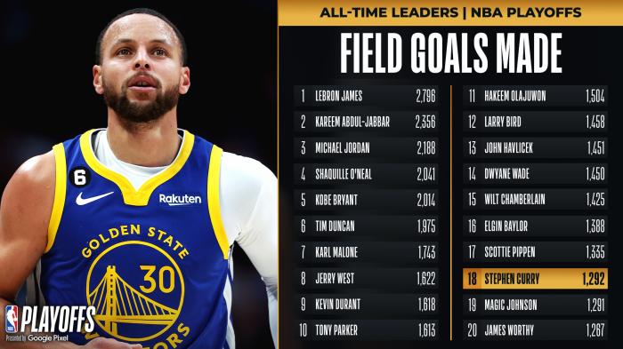 库里也创纪录,首节库里命中一个三分后,其个人生涯季后赛运动战进球数来到了1292个,超越魔术师约翰逊(1291个)升至历史第18位,将追赶皮蓬(1335个)。