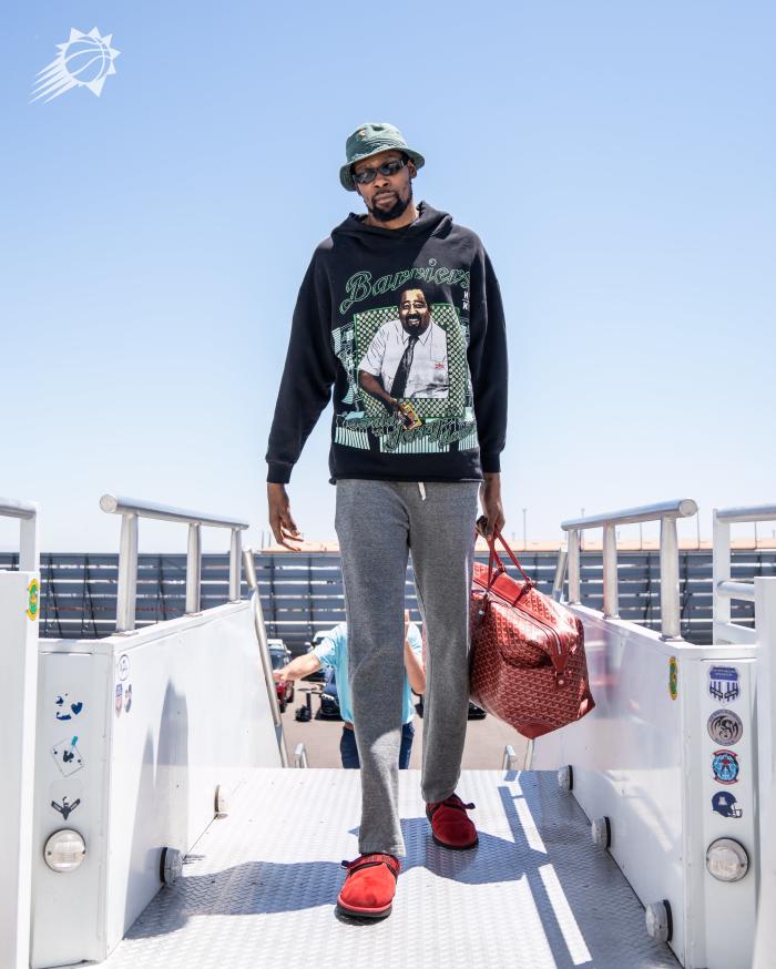 JRS直播网05月09日,NBA季后赛太阳半决赛2-2掘金,G5将在丹佛百事中心球馆对阵,太阳众将已经乘坐飞机飞往丹佛,杜兰特和布克率队出征天王山,杜布登机时都是一脸严肃的表情;保罗确定缺战G5,杜布再次合砍80+得分吗?