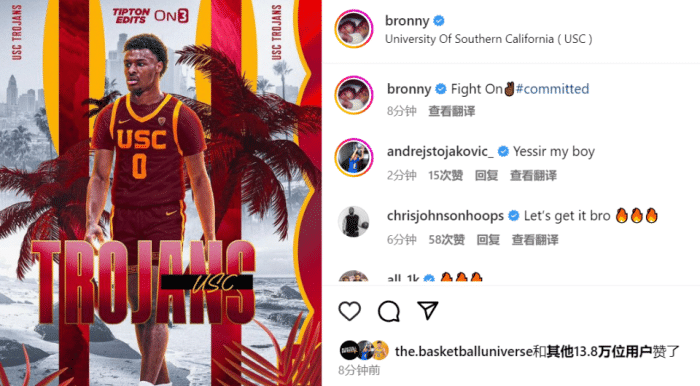 JRS直播网讯05月07日,詹姆斯的儿子布朗尼在社媒上宣布,他将承诺加入南加州大学(USC)。这一选择并不让人感到意外。南加大是选择范围里离家最近的篮球名校,此前美媒ON3的预测中,布朗尼加盟南加州大学(USC)的概率达到了72.3%,加盟俄亥俄州立大学(OSU)的概率为27.5%。