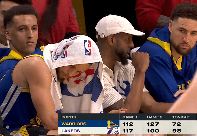 末节詹姆斯继续带队拉开分差,比赛早早失去悬念,老詹提前下场,库里坐在替补席一脸沮丧和无奈。