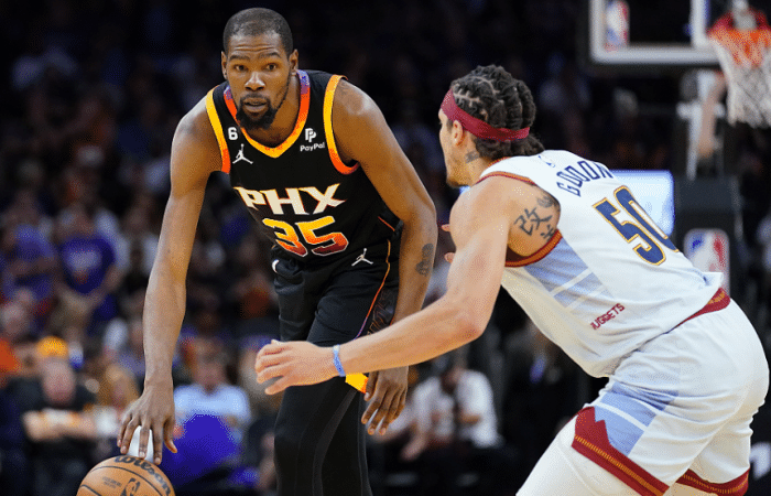 下半场,太阳第三节被掘金打出13-4攻势,暂停回来杜兰特得分止血,布克中投和三分球连得5分,掘金继续反扑并且反超比分,杜兰特轰进三分,之后大帽小波特并且持球反击双手暴扣打停掘金;两队僵持,布克迎着防守轰进三分,杜布单节合砍15分。