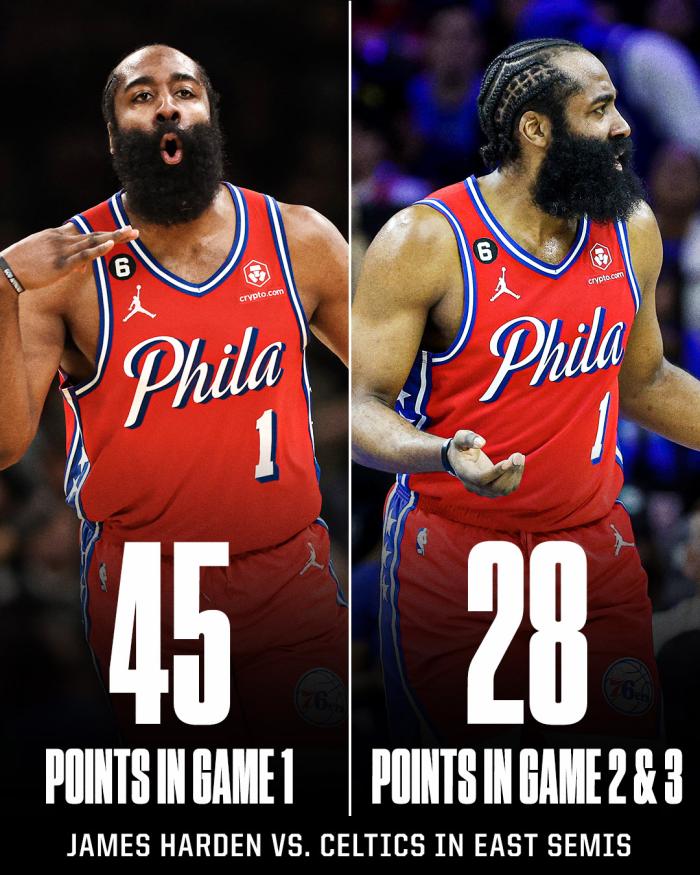 今年季后赛至今,哈登出战全部7场比赛,其中有4场比赛的命中率都低于25%——与篮网G2,13中3,命中率23.1%;与篮网G4,18中4,命中率22.2%;与凯尔特人G2,14中2,命中率14.3%;与凯尔特人G3,14中3,命中率21.4%。