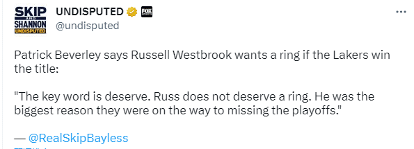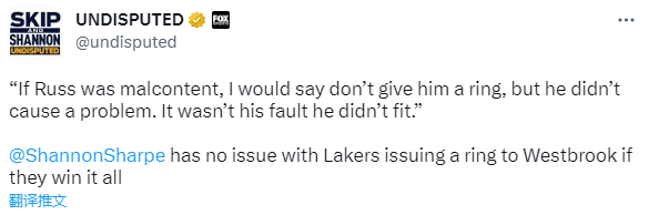 名嘴香农-夏普则力挺威少配得上拿戒指,表示:如果威少过去对湖人不满的话,那我会说别给他戒指,但他并没有制造任何麻烦。他不适配湖人并不是他的错。