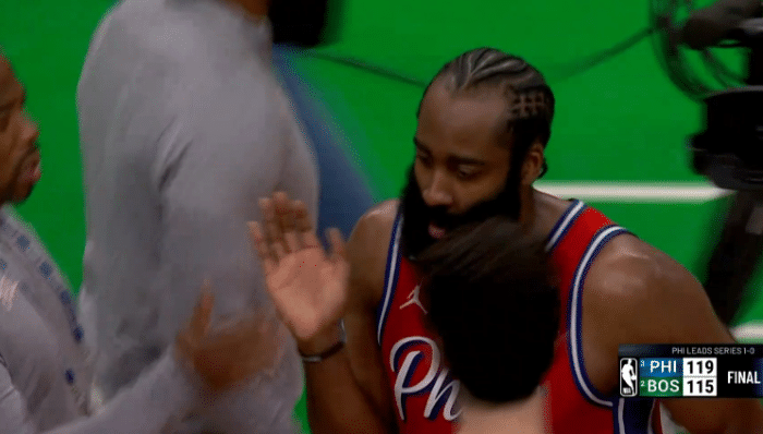 恩比德缺席比赛,但也来到客场,比赛结束之后他带着笑容进入到球场与队友致意,但却被塔克等人无视,大家都沉浸在刚刚赢球的气氛中,所以穿着便装的恩比德略显尴尬。