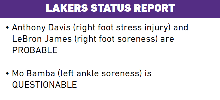浓眉(右脚应力伤势)、詹姆斯(右脚酸痛)大概率出战(75%可能性出战),班巴(左脚踝酸痛)出战成疑(50%出场可能性)