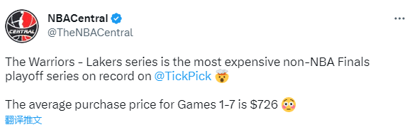据篇票务网站TickPick方面统计,湖勇系列赛G1-G7的平均票价为726美元,这是NBA历史上除总决赛以外、最昂贵的季后赛票价。