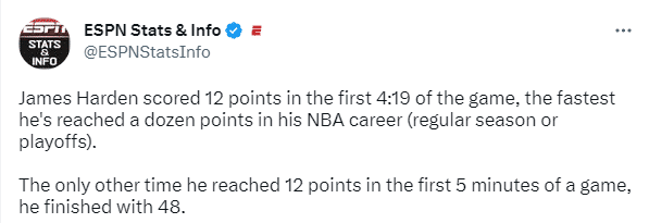 JRS直播网05月02日讯 ,NBA季后赛76人半决赛大战凯尔特人,恩比德因伤缺席G1,哈登上半场出战19分钟14投9中、三分5中3狂砍21分4助攻,首节独砍16分,惨遭斯玛特垫脚险受伤;开场4分19秒连得12分创纪录,创生涯最快得分上双纪录,此前哈登曾开场前5分钟拿到12分,最终全场轰下48分。