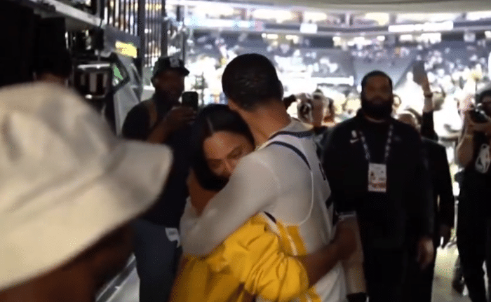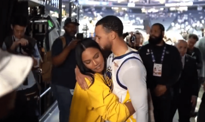 库里在下场的时候拥抱和亲吻了爱人阿耶莎,面带笑容,很显然库里的表现得到了爱人的巨大肯定。一旁的工作人员也都羡慕的看着这对爱人,库里贡献天神下凡一般的表现,而阿耶莎则拥有完美的爱人。