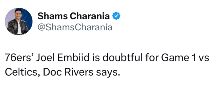 这是根据名记Shams报道76人球星恩比德在4月21日遭遇的右膝伤病,被认为比外侧副韧带一级扭伤更严重。他出战半决赛G1概率较小,只有25%,目前没有参与到训练。此前他就因伤缺席了季后赛对阵篮网的G4,如今看起来养伤这段时间依旧有可能缺席对阵凯尔特人的G1。