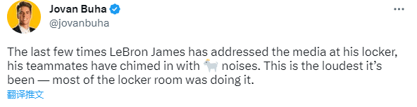 JRS直播网04月05日讯 ,湖人客场加时险胜爵士赛后,湖人更衣室众队友集体模仿山羊叫,相当于力挺詹姆斯是GOAT(历史最佳);据湖人记者Jovan Buha透露,最近一段时间,詹姆斯接受采访时他的队友经常在更衣室模仿山羊叫,这一次是最响亮的一次。