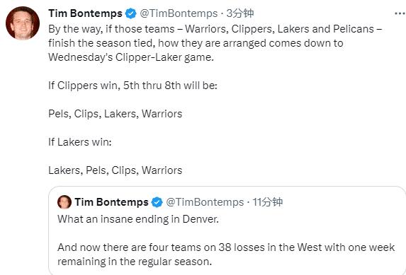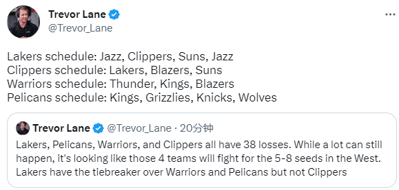 湖人记者Trevor Lane表示湖人、鹈鹕、勇士和快船都是38负,看起来这四支球队将为5-8名而战,剩余赛程湖人先后对阵爵士、快船、太阳和爵士;快船对阵湖人、开拓者和太阳;勇士对阵雷霆、国王和开拓者;鹈鹕对阵国王、灰熊、尼克斯和森林狼。