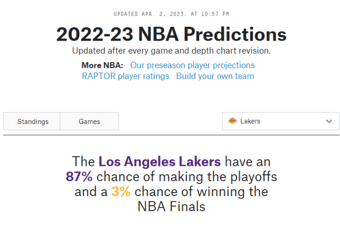 根据权威网站FiveThirtyEight最新预测,湖人晋级季后赛的概率已经升到87%